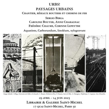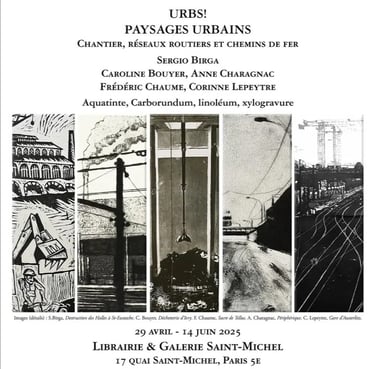 5 visions différentes de ces thématiques urbaines avec des gravures de Sergio Birga, Caroline Bouyer, Anne Charagnac, Frédéric Chaume et Corinne Lepeytre. Je découyvre le travail de trois d'entre eux sur cette thématique urbeix que j'apprécie tant. Très belle initiative de la Librairie & Galerie Saint-Michel à Paris. A. Charagnac rejoint ma collection avec son interprétation des tours duo de Jean Nouvel.