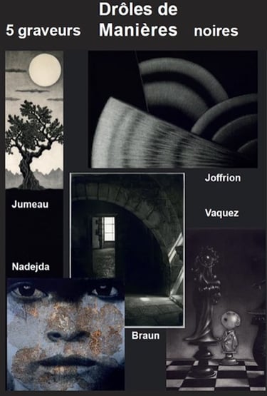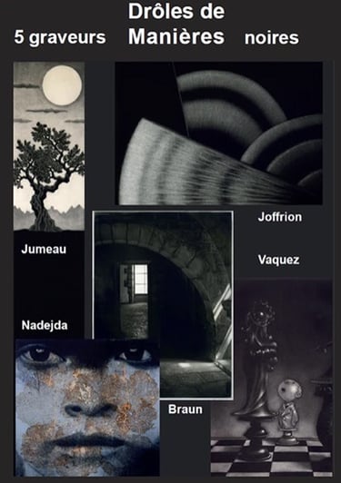 5 graveurs en Manière Noire (G. Braun, M. Joffrion, N. Menier, M. Jumeau, P. Vaquez) exposent dans le très beau cadre du Chateau des Tourelles au Plessis-Trèvise (94). J'ai retrouvé Guy Braun déjà rencontré à St Sulpice et dont le travail est impressionnant et émouvant. Découverte du travail de Nadjeda Menier avec de magnifiques portraits. Quelle richesse dans les noirs. C'est décidément une approche de la gravure que j'adore.