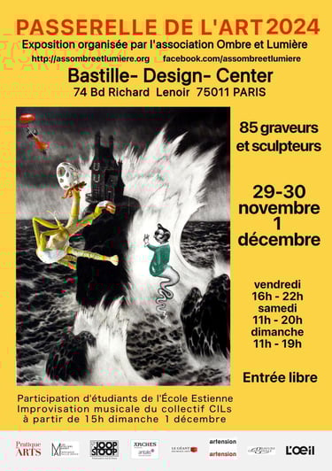 Passerelle de l'Art , exposition organisée par l'association Ombre et Lumière au Bastille Design Center (Paris) avec 60 graveurs, 9 élèves du parcours gravure et image imprimée et 16 sculpteurs. Belle rencontre avec H. Bascoul dont le travail rejoint ma collection